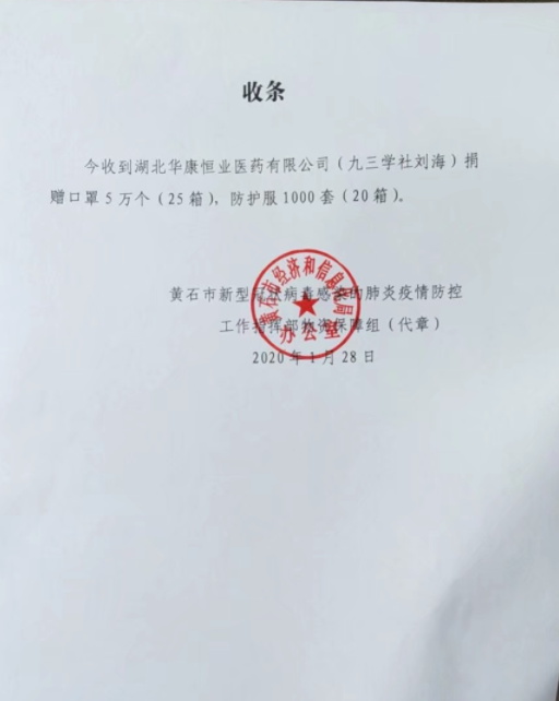 2、華(hua)康(kang)恒業捐贈黃(huang)石疫情防(fang)控指(zhi)揮部口罩(zhao)50000只防(fang)護服1000套;